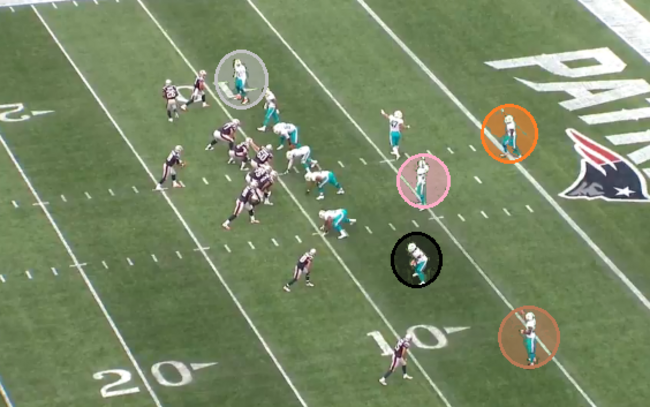 With Reshad Jones (pink), Byron Maxwell (grey), Xavien Howard (brown) and Bobby McCain (black) in man coverage, this leaves James White uncovered so Abdul-Quddus moves into man-on-man coverage with the Patriots running back.