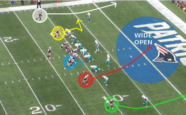 They’re joined by three receivers: Danny Amendola (red), Chris Hogan (green) and Julian Edelman (yellow).