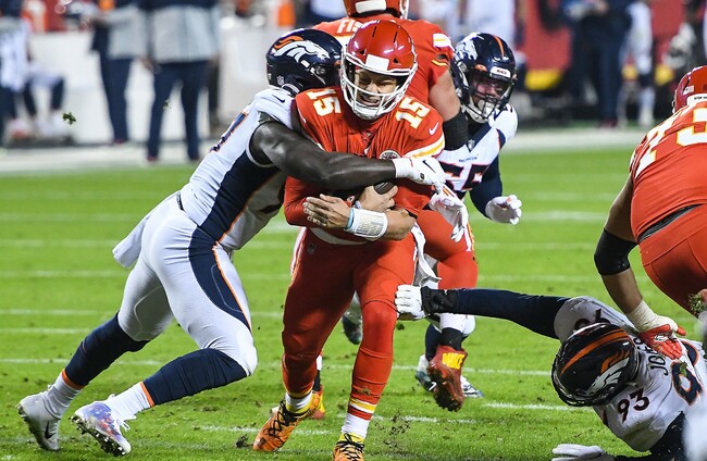 Kansas City Chiefs quarterback Patrick Mahomes is sacked by Denver Broncos outside linebacker Jeremiah Attaochu. SIPA USA/PA Images