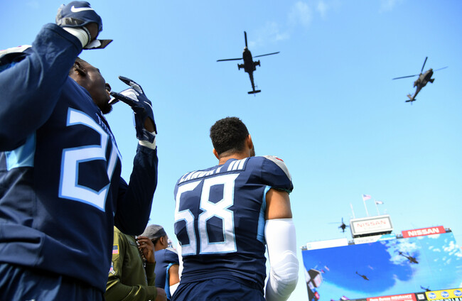 Titans defensive back Kenneth Durden (20) and linebacker Harold Landry (58) watch a flyover by the 101st Airborne before their game against the New England Patriots SIPA USA/PA Images