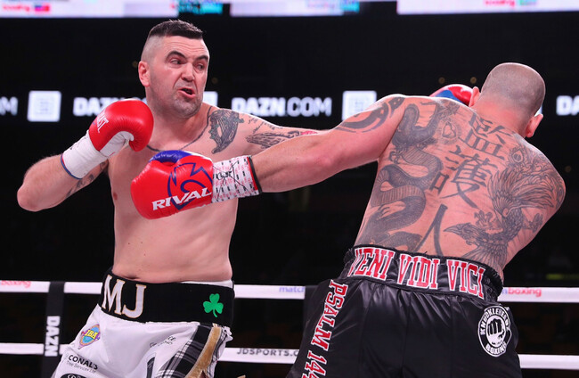 Kennedy couldn’t have anticipated the judo throw which groundee him in the second, however; Barrett hooked his leg around Kennedy’s in the clinch and torpedoed him to the canvas. Inexplicably, he wasn’t so much as docked a point, and his extended olive branch was dismissed by the peeved Irishman who, rather than touch gloves, beckoned Barrett on for a tear-up.
