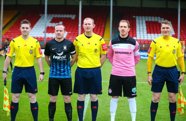 Athlone's Niall Scullion (left) and Shelbourne's Dean Delaney with the match officials ahead of the coin toss prior to last week's match. Oisin Keniry/INPHO