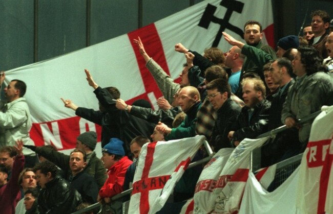 (English football hooligans pictured at Lansdowne Road in 1995)