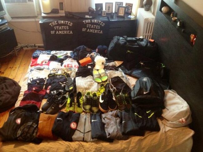 American fencer Race Imboden took the time to lay out all of his Nike swag on his bed to get the full effect. From the looks of it, you get: five pairs of shoes, nine zip-up jackets, ~10 different shirts, two pairs of sandals, and four different bags.