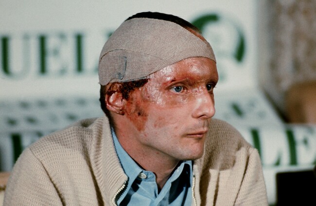 The Austrian Formula 1 driver Niki Lauda with scarred face, head bandage and burns during a press conference after a near-fatal accident. DPA/PA Images