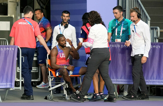 Lyles, who had been bidding to complete a 100m-200m double in Paris, was taken off the track in a wheelchair following the race, won by Botswana’s Letsile Tebogo.