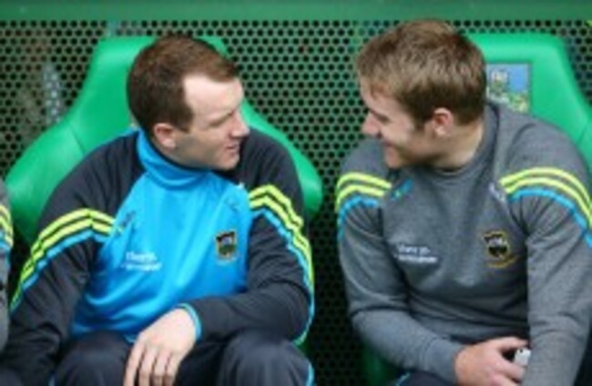 McGrath, right, chats to Lar Corbett on the bench during the Munster SHC semi-final. McGrath is "in the mix" for Sunday's All-Ireland semi-final, manager Eamon O'Shea said. Cathal Noonan/INPHO