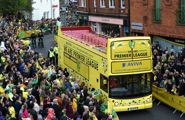 THERE WERE COMICAL scenes in Norwich City Centre on Monday afternoon, as the club’s promotion parade was dealt a blow after their bus broke down.
