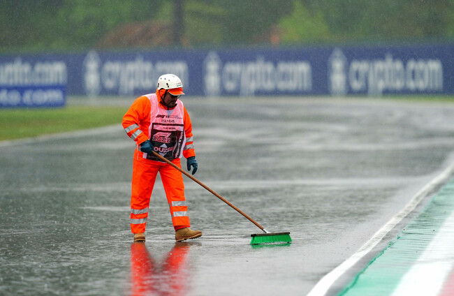 File photo dated 22-04-2022 of A member of staff working to clear excess water off of the track ahead of Practice 1 of the Emilia Romagna Grand Prix. Alamy Stock Photo