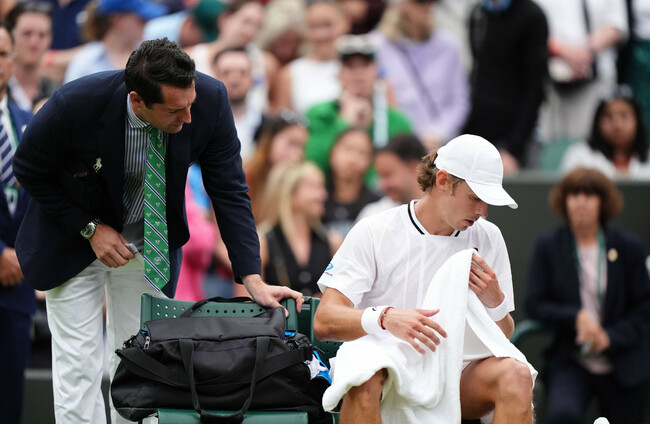 Alex de Minaur in distress after victory over Arthur Fils. Alamy Stock Photo