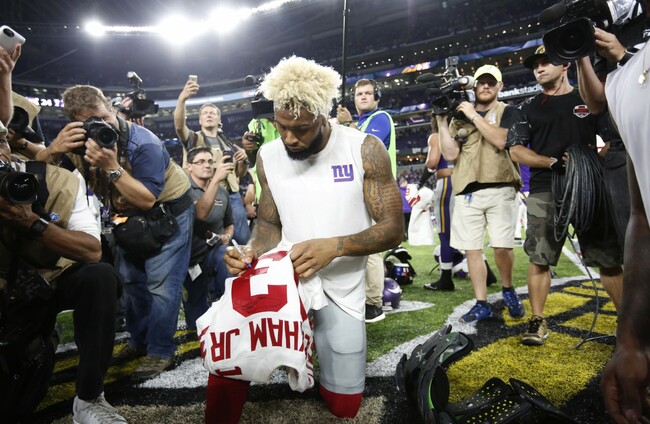 New York Giants wide receiver Odell Beckham autographs his jersey after an NFL football game against the Minnesota Vikings. Andy Clayton-King