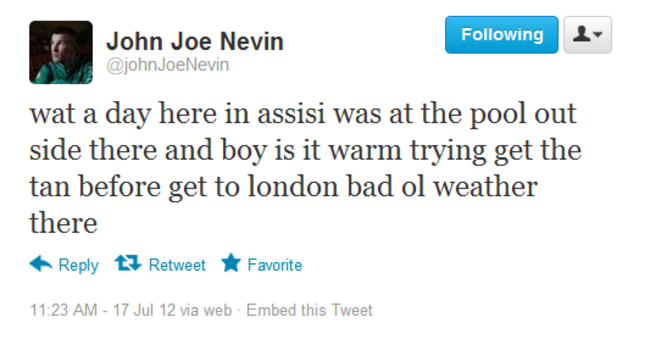On the Twitter: Yes, you can follow @johnJoeNevin but as of last Friday he has given it up for the Games. However, he has enlisted help to tweet updates of his progress. Post-Olympics, here’s an example of what you might expect. Nevin knows how to chill out.