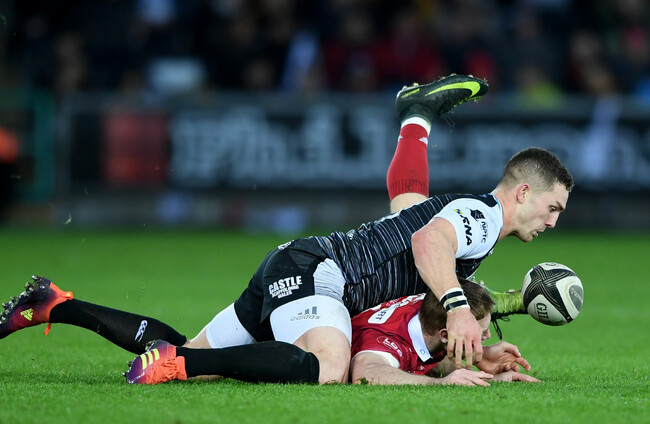 Johnny McNicholl of the Scarlets is tackled by George North of the Ospreys. Alex Davidson / INPHO