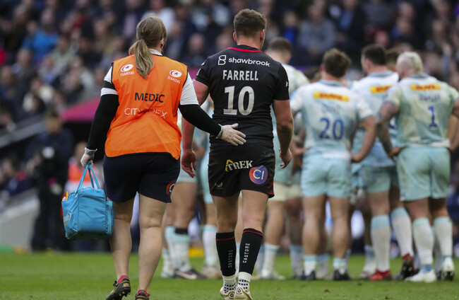 Farrell hobbled off in the 70th minute as Saracens edged London rivals Harlequins 36-24 after rolling his left foot while making a tackle, prompting him to cry out in pain and then sit in the dugout with ice strapped to the injury.