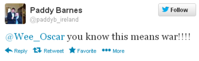 But when he called around to Barnes’ Belfast house for the duel and found nobody home, the four-year-old pelted the windows instead and chuckled: “Take that, Paddy Barnes.”