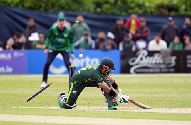 Pakistan's Mohammad Rizwan is bowled by Ireland's Mark Adair (not pictured) during the third T20 international. Niall Carson/PA Images / Alamy Stock Photo