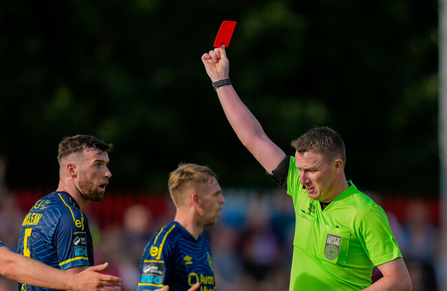 Referee Damien MacGraith’s misinterpretation of the situation saw him send off McClean, with Pats going on to win the game 3-0 against 10 men.