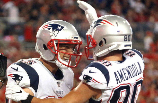 The Patriots were playing without tight end Rob Gronkowski, who was inactive with a bruised thigh. Hogan and Danny Amendola picked up the slack. Each caught eight passes with Amendola going for 77 yards while Hogan had 74 receiving yards and the score.