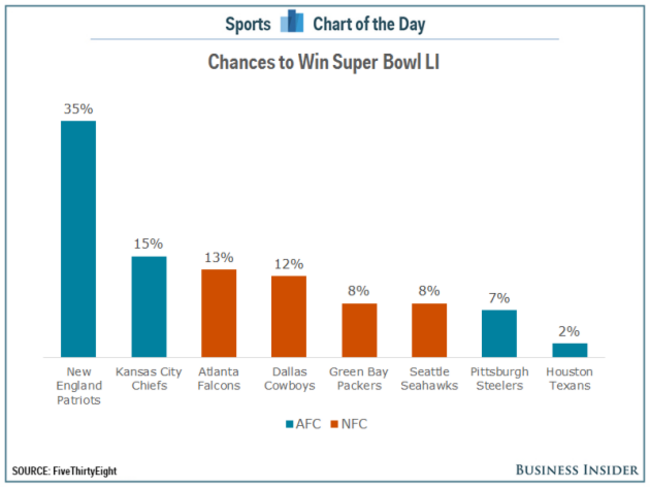 Using a rating system that accounts for margin of victory, home-field advantage, strength of schedule, and prior performance, and then simulating the playoffs thousands of times, Silver determined the probability each team has of winning the Super Bowl.