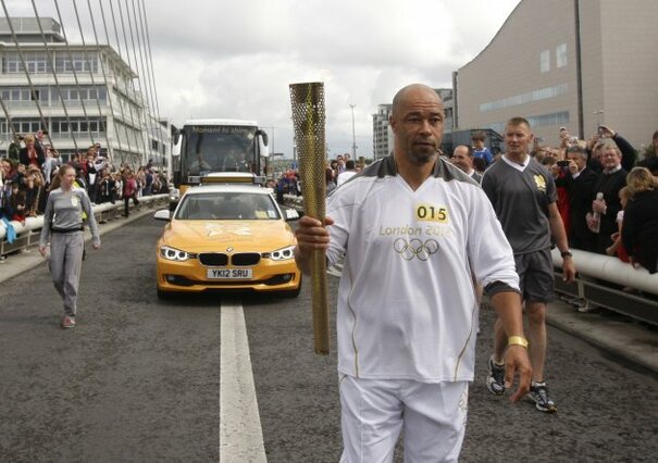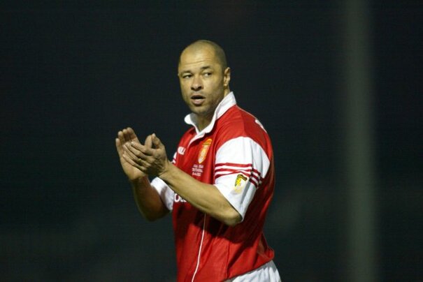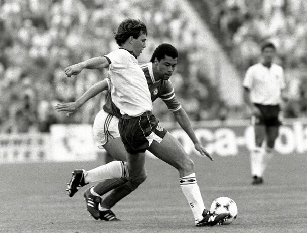 Challenging Spain's Emilio Butragueno with Chris Hughton