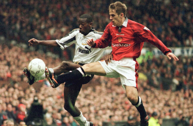 Things got a lot worse for Neville and his team minutes later when Wanchope picked up the ball in his own half. He effortlessly glided towards the United goal, Neville – thrashing and trailing behind him. Gary Pallister was easily swept aside too, Wanchope’s rubbery legs breezing past him from right to left. Gary Neville backed off too, unsure of how to deal with him and probably wary of conceding a penalty. As Wanchope inched closer to Peter Schmeichel’s net, he surprised the keeper by shooting early and with his right foot instead of his left , the accuracy of the finish – just a careful push to the far corner rather than a more powerful effort – ensured a two-goal Derby lead.