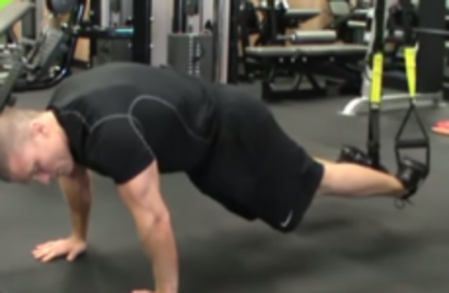 Starting position: Get into the plank position. (Kneel on your hands and knees, facing away from a TRX with your feet hooked into the foot cradles.)