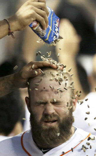 Houston Astros' Evan Gattis gets a sunflower seed shower after hitting a three-run homer.