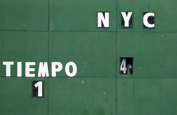 A stadium worker puts up the number four on the scoreboard after the New York Cosmos scored their fourth goal against Cuba.