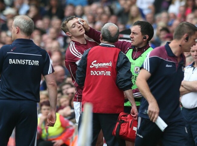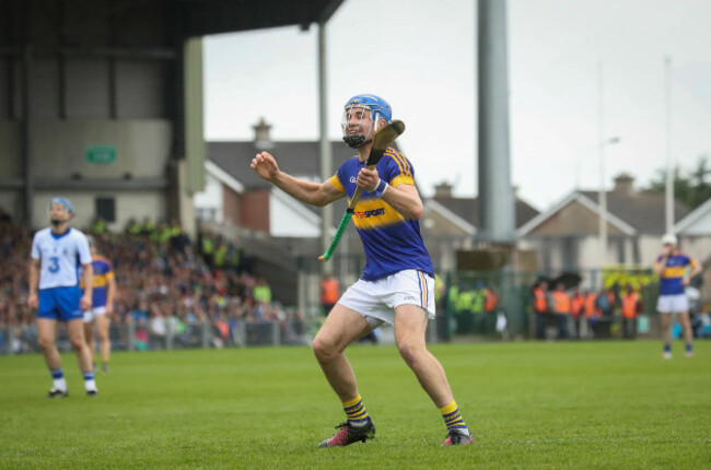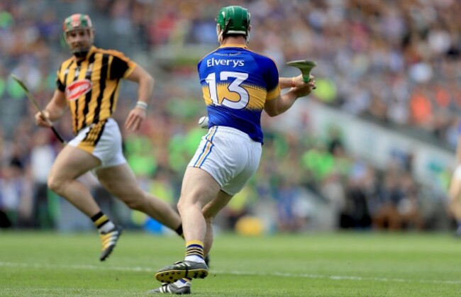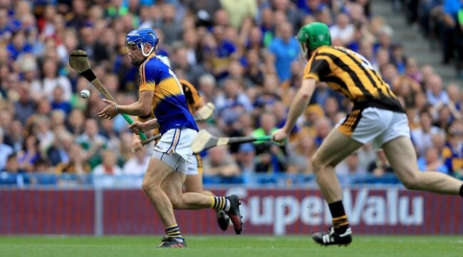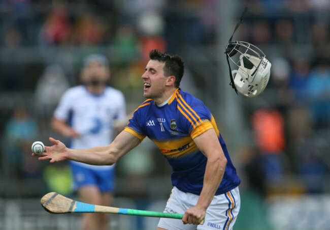 Patrick ‘Bonner’ Maher is one of Tipperary’s most consistent players. Here, he still manages to get a pass away despite losing his helmet…