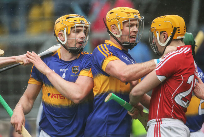 A sign of things to come…The Maher brothers, Ronan (left) and Pádraic back each other up against Cork in Tipp’s Munster senior hurling championship opener…