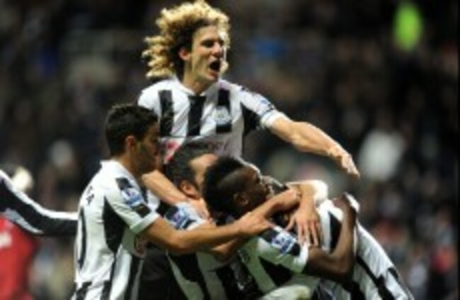 Newcastle United players mob Papiss Cisse after his late goal. Owen Humphreys/PA Wire