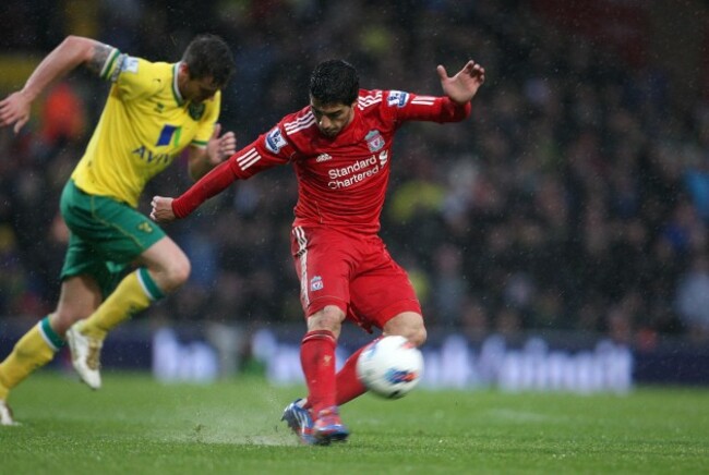 Luis Suarez completes his hat-trick against Norwich. / Chris Radburn/PA Wire/Press Association Images