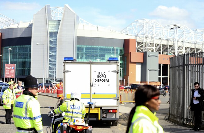 Sections of Old Trafford were evacuated before this afternoon’s scheduled 3pm kick-off after a ‘suspect package,’ later discovered to be the target of a training exercise, was discovered in the north-west corner of the stadium.