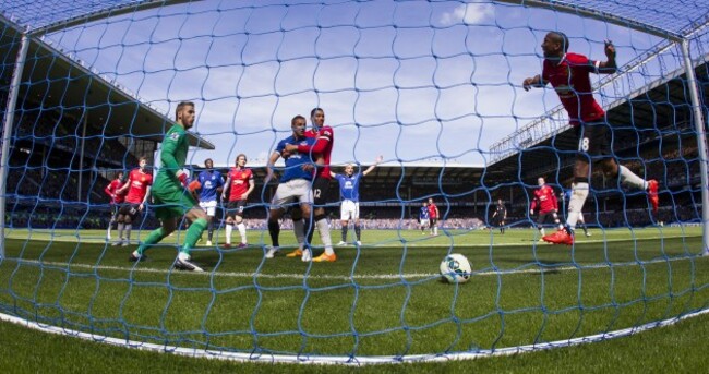 Manchester United's Ashley Young, right, attempts in vain to stop the ball entering the net as Everton's John Stones, out of frame, scores his team's second goal. AP/Press Association Images