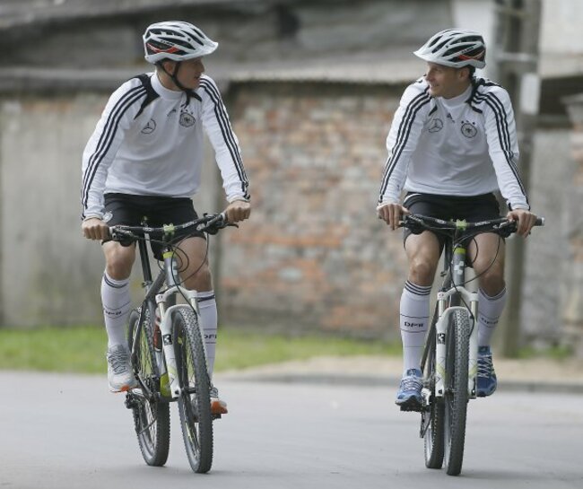 Germany’s Benedikt Hoewedes, right, and Lars Bender ride their bicycles to get to the training ground of Germany at the Euro 2012 soccer championship in Gdansk. (AP Photo/Frank Augstein)