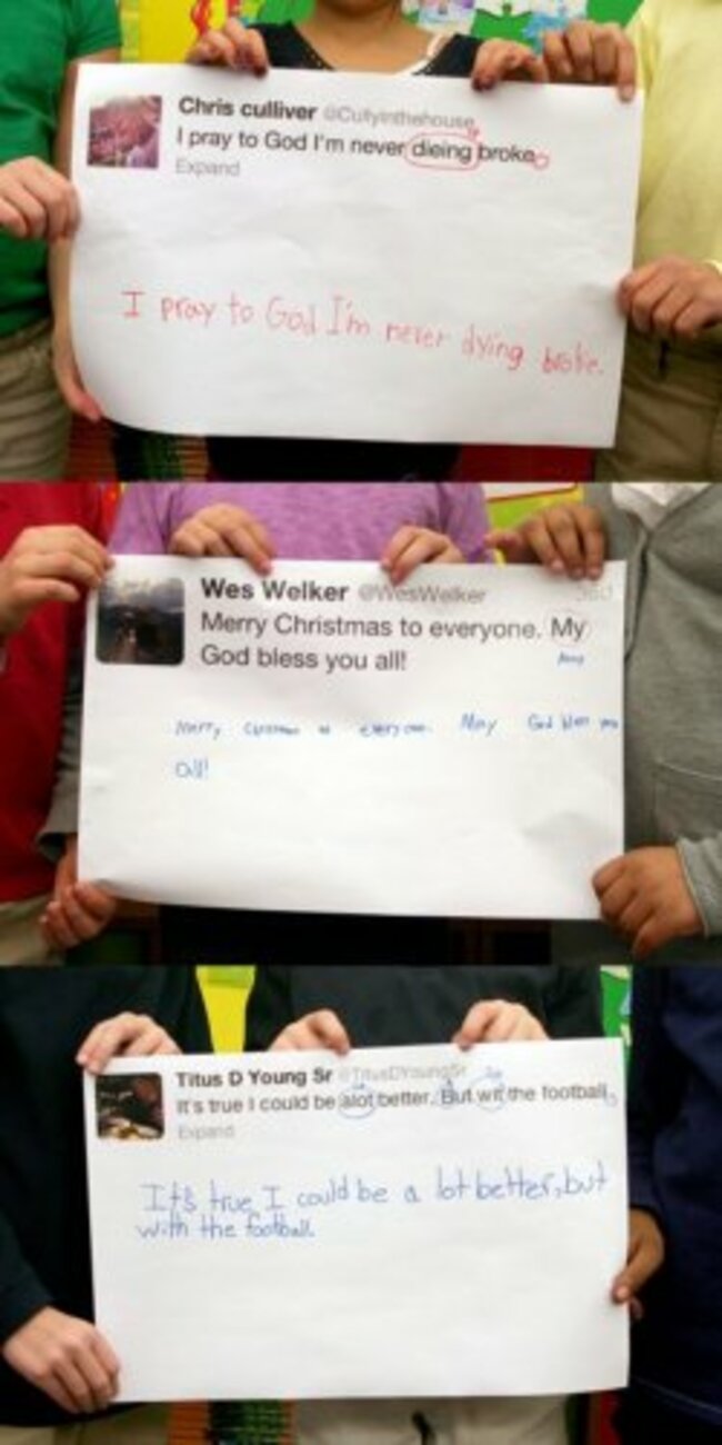 The school posted this photo series on its Facebook page. It looks like the youngsters corrected tweets from Chris Culliver (49ers), Wes Welker (Patriots), and Titus Young (Lions).