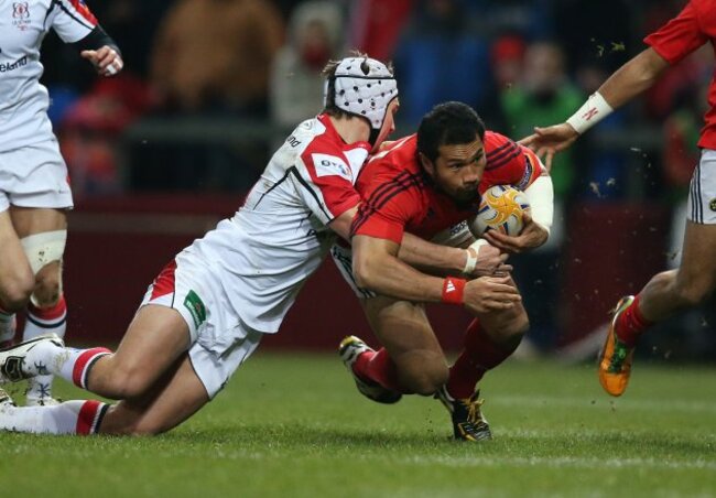 Ulster’s Michael Allen tackles Casey Laulala of Munster. (©INPHO/Billy Stickland)