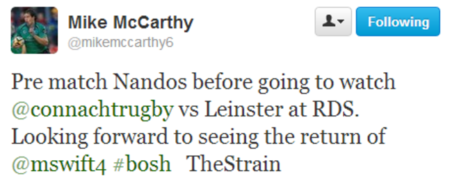 McCarthy, having been in Carton House for a two-day Irish training camp last week, was in Dublin on Saturday to cheer on Connacht as they battled against the team he will be joining in the summer.