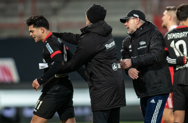 Nadiem Amiri (l) of Bayer Leverkusen moves away from Union Berlin coach Urs Fischer. DPA/PA Images