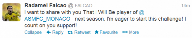 We are absolutely delighted that Radamel Falco has accepted the challenge of coming to play for AS Monaco FC,” club Dmity Rybolovlev said on their website.