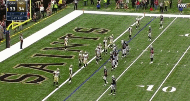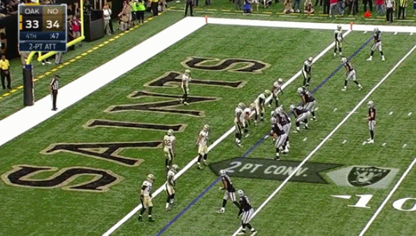 The Raiders immediately signalled they were going for two after Seth Roberts scored the touchdown to bring them within one. They lined up with fullback Jamize Olawale out to the left to ascertain if the Saints were in zone or man coverage.