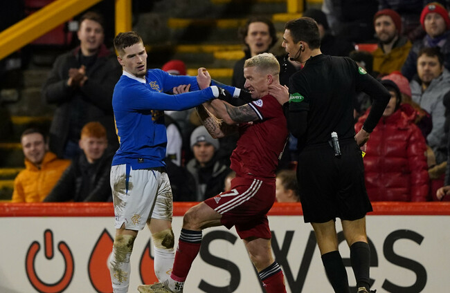 The major first-half talking point came after Irish winger Jonny Hayes sent Hedges clear with a long diagonal ball. The Dons player got a foot to the ball as McGregor threw himself at it and bumped into the Welshman. There was clear contact with Hedges’ leg and the Aberdeen player went down but Clancy was unconvinced and Rangers played on.