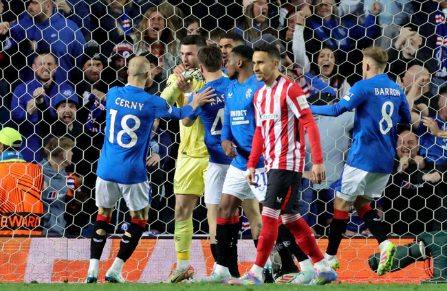 Late penalty save ensures first-leg draw for 10-man Rangers