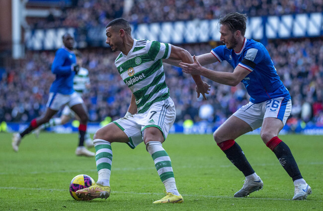 Giorgos Giakoumakis of Celtic and Ben Davies of Rangers in action earlier this month. Richard Callis