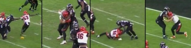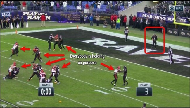 After Koch took the snap, it looked like a WWE Royal Rumble broke out all over the field. Everywhere you looked a Ravens player was holding a Bengals defender and flags came flying from the officials.