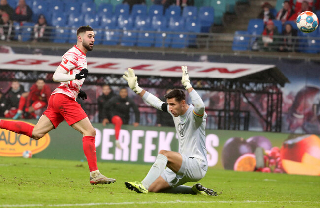 Wolfsburg wasted a golden double chance just before half-time when Leipzig goalkeeper Peter Gulacsi denied Belgian midfielder Aster Vranckx at close range, then Konrad Laimer just managed to block Yannick Gerhardt’s shot.