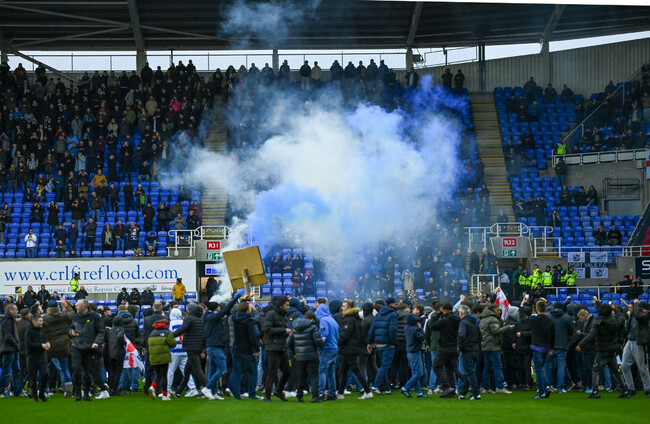 Referee Ross Joyce took the players into the dressing rooms, while the supporters milled around the pitch, some letting off blue flares.