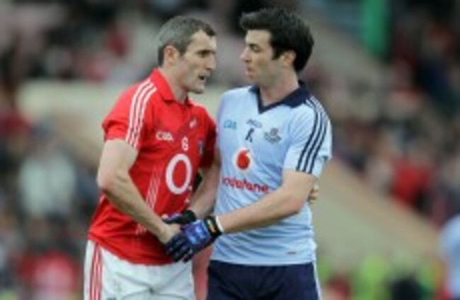 Cork's Graham Canty with Michael Darragh MacAuley of Dublin at the end of the game. INPHO/Donall Farmer
