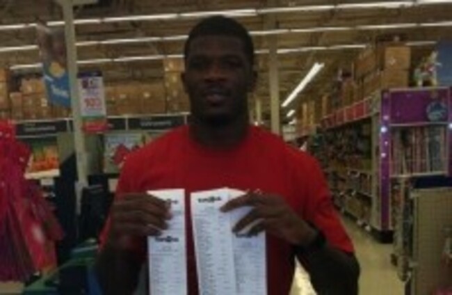 THIS PHOTO OF Houston Texans star Andre Johnson holding a ridiculously long receipt from Toys ‘R’ Us blew up on Reddit today, and there’s actually a great story behind it.