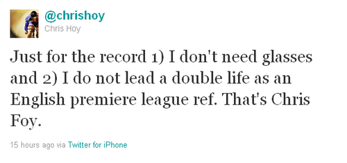 “Just for the record 1) I don’t need glasses and 2) I do not lead a double life as an English [Premier League] ref. That’s Chris Foy,” Hoy tweeted last night in an attempt to end the confusion.